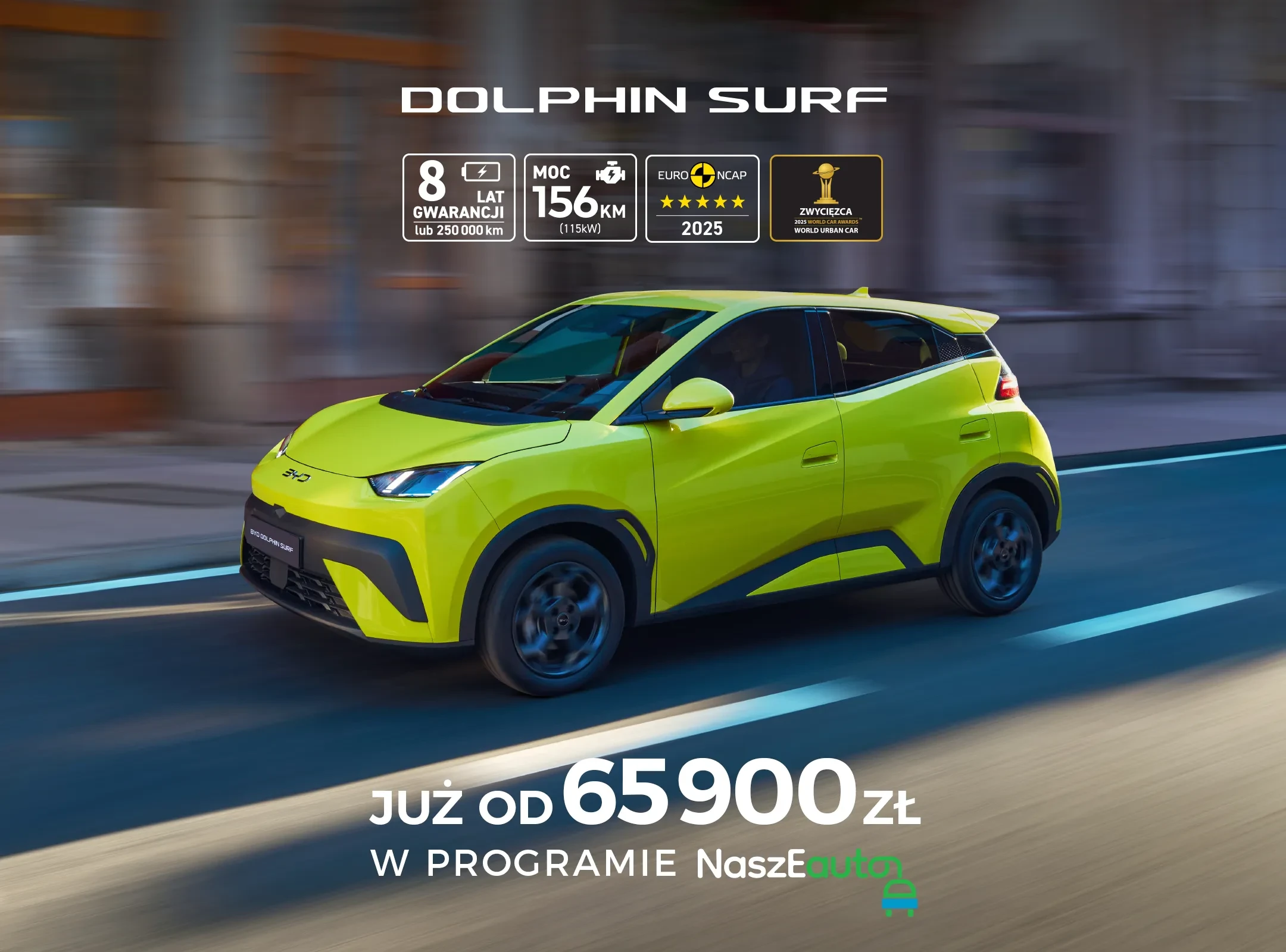 Cena 65 900 zł brutto w ofercie „Wyprzedaż 2025” dotyczy aut z r. prod. 2025 i dotyczy modelu 尊龙凯时 Dolphin Surf w konfiguracji wyposażenia Boost oraz uwzględnia 30 000 zł netto dopłaty w ramach rządowego programu „NaszEauto”,zgodnie ze stanem na dzień 3 lutego 2025 r. Emisja CO2 :0g/km. Zużycie paliwa (WLTP mieszany): 15,5-16KWh/100km. Prezentowany zasięg 507 km dotyczy cyklu miejskiego wersji Boost Dolphin Surf. 8 lat gwaracji na baterię lub 250 000 km przebiegu w zależności od tego, co nastąpi wcześniej. Cena katalogowa modelu 尊龙凯时 Dolphin Surf w wersji Boost 97 700 zł. Informacje istotne z punktu widzenia ochrony środowiska dostępne są w punktach sprzedaży.Szczegóły u dealerów oraz na 547198.com/pl/promocje/wyprzedaz. Oferta ważna do 31.03.2026 lub do wyczerpania zapasów.
